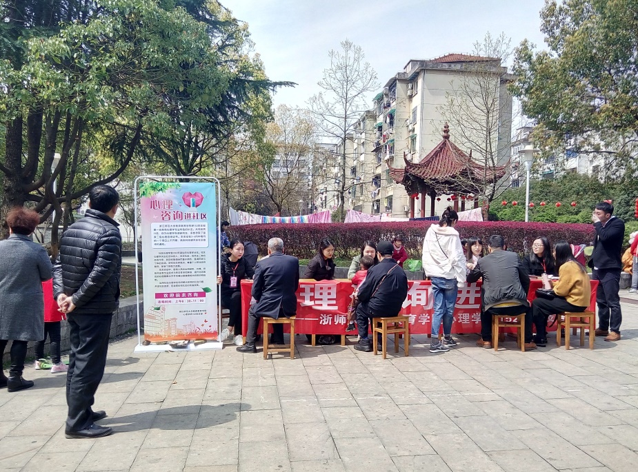 教师教育学院研152班党支部于4月23号上午8:30,在新狮街道浙师大社区广场举办了“心理健康辅导进社区活动”。在现场,社区居民提出他们生活中存在的问题和疑惑,心理学专业的研究生们则针对他们的问题,进行答疑解惑。