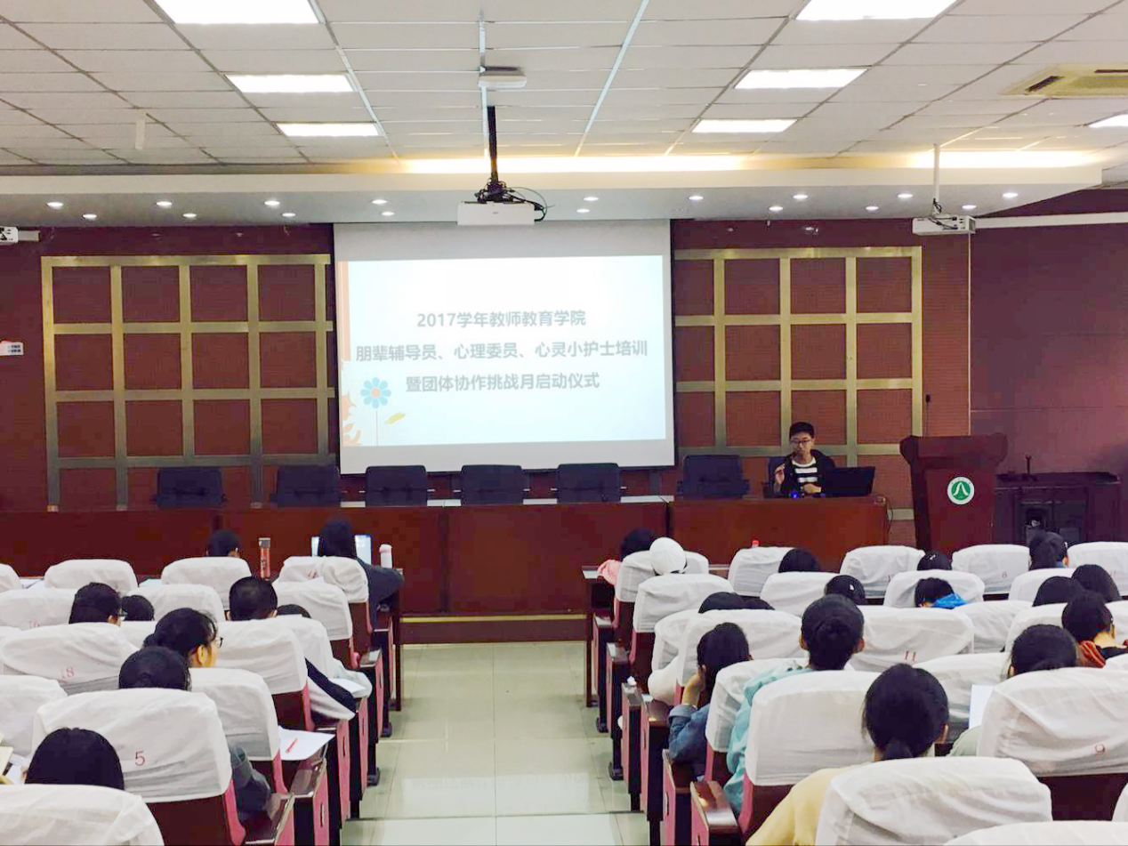 10月29号上午9时,教师教育学院2017学年朋辈辅导员、心理委员、心灵小护士培训会暨团体协作挑战月启动仪式在17幢112报告厅顺利举行。