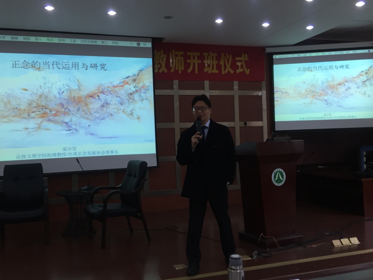 2017年11月25日-11月30日,由浙师大教师教育学院主办的“正念减压技术在教育教学中的应用”暨“正念教师”初阶培训工作坊,在我校举行。工作坊由来自台湾法鼓文理学院的温宗堃、我校正念研究实验室主任宋晓兰以及浙江科技学院的王艳明带领。这是正念训练系统在我省乃至全国首次进入基础教育领域,是将正念训练引入教师发展培训及校园文化建设的大胆尝试。工作坊受到了受训教师的一致好评,大家纷纷表示,这种有别于传统的认知式学习的体验式学习,对个人和工作的帮助非常大,有助人情绪管理、平衡家庭-工作冲突,以及在工作中真诚友善地处理同事关系及师生关系;并且,非常有必要将正念训练带入课堂教学以帮助提高学生的学习效率和情绪管理。
