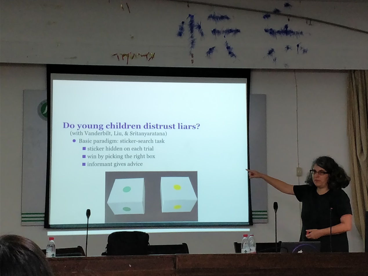 在过去的20年中,Heyman教授一直致力于研究儿童的社会性发展研究。在讲座中,她通过简单而有趣的实验设计,结合成人世界里对于外在线索的推断差异与疑问,为大家展示了儿童如何采纳与辨别不同信息提供者的情况。Heyman教授的行为实验展示了儿童对于有效的信息提供者与无效信息提供者在任务中采择发展过程。即,年幼的儿童能够选择采纳有效的信息提供者的意见来帮助自己完成相关任务,而不是那些糟糕的信息提供者。但是当只有一名信息提供者时,即使是一个糟糕的信息提供者,儿童也对提供者有着很强的采择倾向。儿童的信息推理以及相关的社会性发展能力与儿童的执行功能与心理理论发展密切相关。
