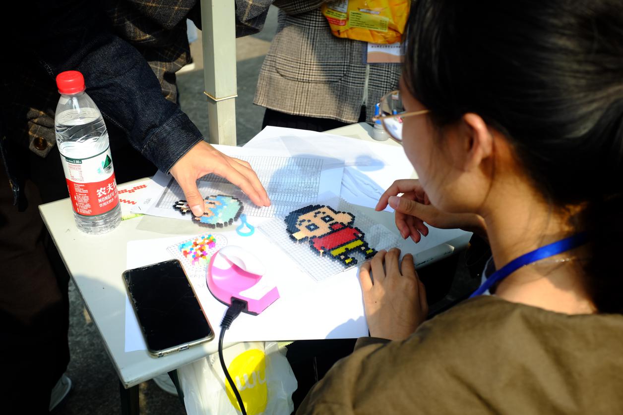 活动一开场,“点豆豆,拼未来”的活动摊位前就站满了人,桌上放满了一盒盒五颜六色的拼豆。同学们不断激发想象力,凭着巧思巧手围绕“期待未来”的主题用拼豆制作出一幅幅充满了奇思妙想的图案,无一不展现出青春的缤纷活力。同时,这一活动还吸引了许多教职工和小朋友们,他们手把手制作作品的画面尽然展现浓浓亲子温情。