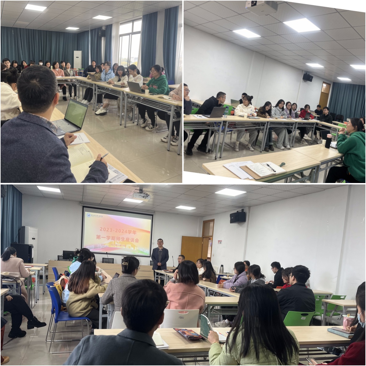 《发展与教育心理学》教师教育必修课程于11月8日中午在16-303进行了师生交流和教学研讨。22级各班课代表首先反馈了班里同学对于课程和课堂的意见与建议,此后己上完课程的21级的三位课代表也分享了该课程对于教师资格证考试的影响及其在教育见习中的应用。任课老师认真听取了建议,并对同学们关注的课堂需求做了回应和解答。本次交流研讨有效促进了师生了解、需求对接和后续教学改进。