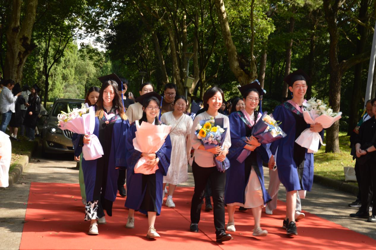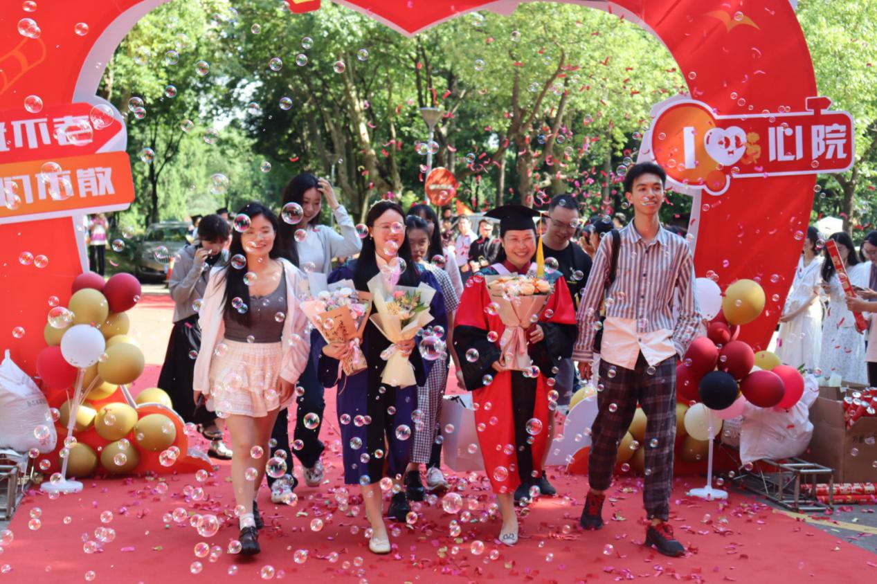 阳光下飞舞着泡沫与彩带,红毯上绽放着五彩的青春、印刻着奋进的足迹。典礼开始前,2024届毕业生在导师、班主任的带领下走上红毯,迎接鲜花与礼炮,携手走向未来。