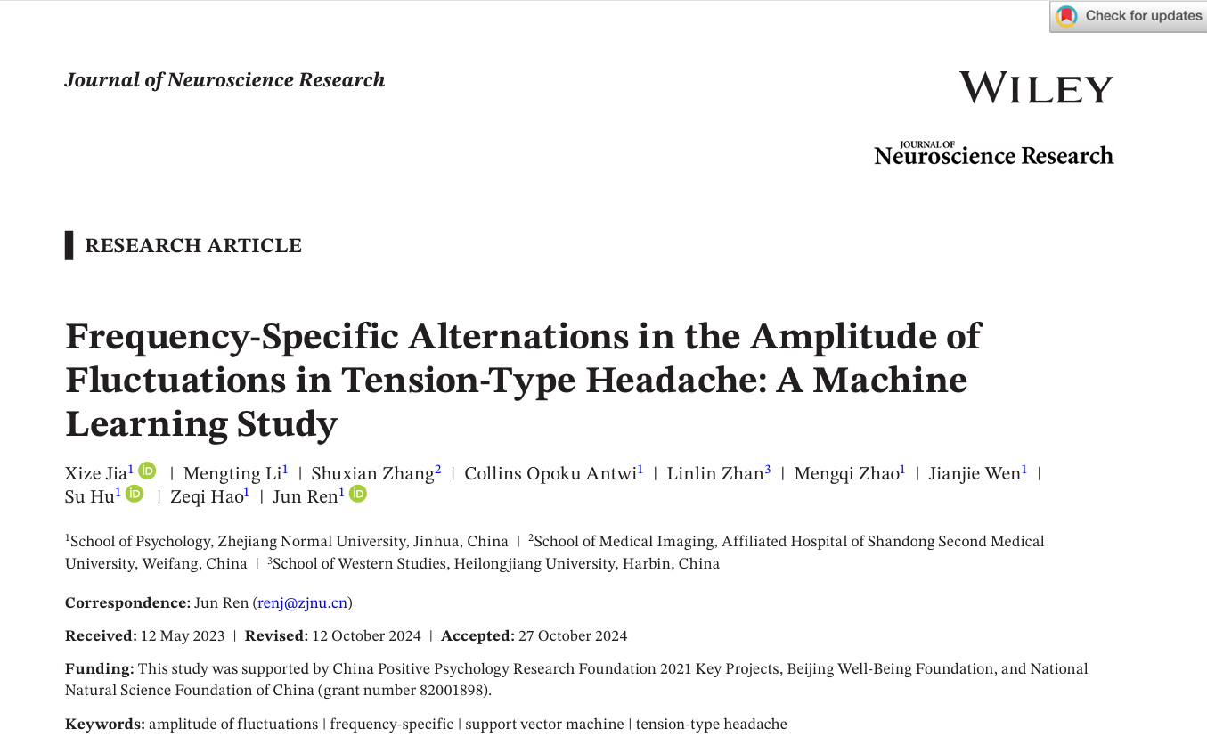 近期,永利23411集团任俊教授和贾熙泽教授分别在Wiley Interdisciplinary Reviews-Cognitive Science(中科院二区)和Journal of Neuroscience Research(中科院三区)期刊发表了题为Local brain abnormalities in emotional disorders: Evidence from resting state fMRI studies和Frequency- Specific Alternations in the Amplitude of Fluctuations in Tension- Type Headache: A Machine Learning Study的学术论文。贾熙泽为论文的第一作者,任俊教授为通讯作者,两项研究均得到了国家青年自然科学基金(82001898)的资助。论文来源:Jia, X., Li, M., Wang, C., Antwi, C. O., Darko, A. P., Zhang, B., & Ren, J. (2024). Local brain abnormalities in emotional disorders: Evidence from resting state fMRI studies. WIREs Cognitive Science, 15(6), e1694. https://doi.org/10.1002/wcs.1694Jia, X., Li, M., Zhang, S., Antwi, C. O., Zhan, L., Zhao, M., Wen, J., Hu, S., Hao, Z., & Ren, J. (2024). Frequency-Specific Alternations in the Amplitude of Fluctuations in Tension-Type Headache: A Machine Learning Study. Journal of Neuroscience Research, 102(11), e25398. https://doi.org/10.1002/jnr.25398