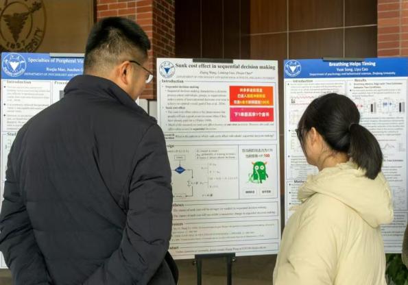 下午的活动迎来了高潮——海报交流指导环节。浙江大学心理学系的张智君、陈辉、周宵、潘亚峰、吴明证等专家亲临现场,认真评阅了两校创新拔尖班同学们制作的学术海报,并对海报进行了细致的点评和指导。同学们认真聆听,积极互动,不仅展示了各自的学术成果,还从专家的反馈中汲取了宝贵的经验。这一环节不仅锻炼了同学们的学术表达能力,也促进了双方在学术思维上的深度碰撞。