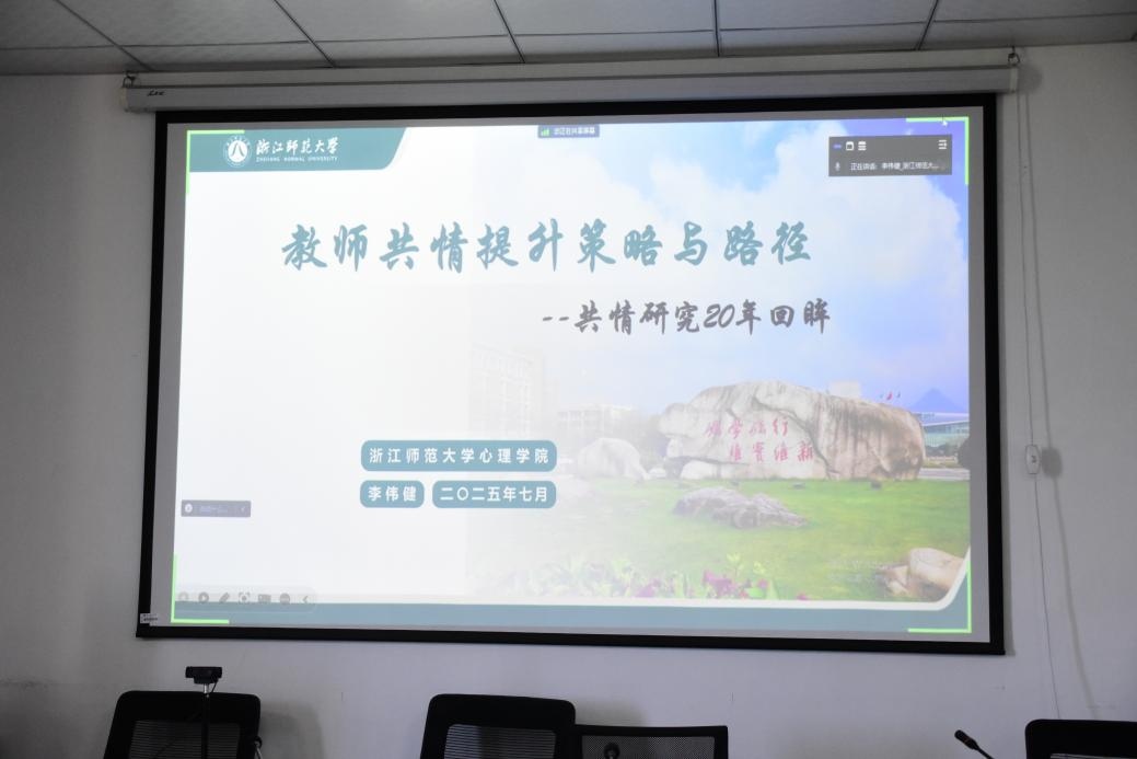 中国心理学会常务理事、浙江师范大学心理学学科带头人李伟健教授首先作了题为《教师共情提升策略与路径——共情研究20年回眸》的主旨报告。李伟健教授在报告中回顾了20年来教师共情研究的历程,并展示了团队在教师共情领域的代表性成果,包括共情能力与学生学业成绩的正相关关系、共情发展的悖论现象等。针对共情能力提升,他提出了多项策略,包括通过视频录制与反馈训练提高共情准确性,以及重塑教师思维模式以增强共情动机,为教师专业成长提供了科学指导。