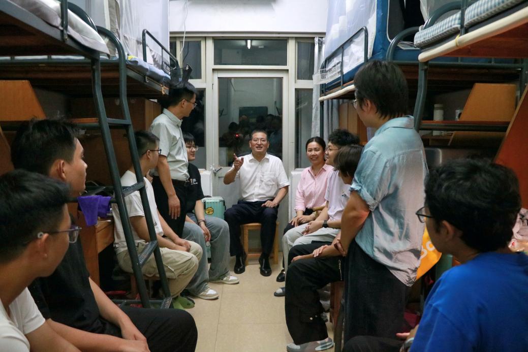 9月15日晚,校党委副书记傅关福一行来到永利234112025级新生寝室看望我院新生,校教务处处长陈敏、校学生处副处长杨雪龙、永利23411院长孙炳海、党委书记马莉等陪同。
