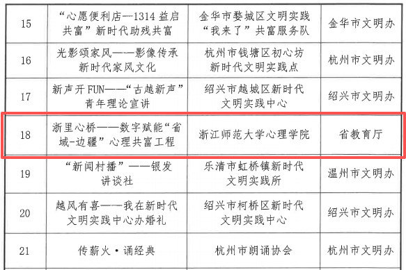 近日,浙江省精神文明建设办公室公布了2025年全省新时代文明实践推广项目名单。由永利23411集团牵头实施的 “浙里心桥——数字赋能‘省域-边疆’心理共富工程” 成功入选,成为全省新时代文明实践的优秀代表项目之一。该项目是今年全省唯一入选的高校项目,生动诠释了“心理学可以为社会做什么”的实践答案,彰显了我院在社会心理服务与精神文明建设中的引领作用。