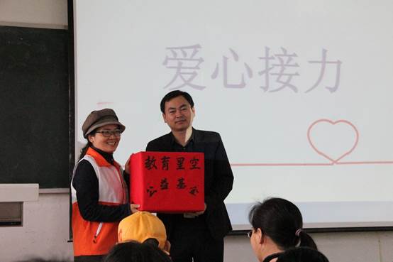 在仪式开始前,在场每个人都拿到了一张爱心卡片,这张卡片作为教育星空公益基金的门票,表达本基金“以精神上的陪伴代替单纯的物质资助“这一特色,引导大家写下自己希望奉献的爱心投入捐赠箱中,公益基金管理人员也会将这些资料记入档案,为有需要的人送去帮助。装满爱心的捐赠箱由狄伟锋副书记交给阳光爱心义工协会徐美儿会长,完成了一场动人的爱心接力。