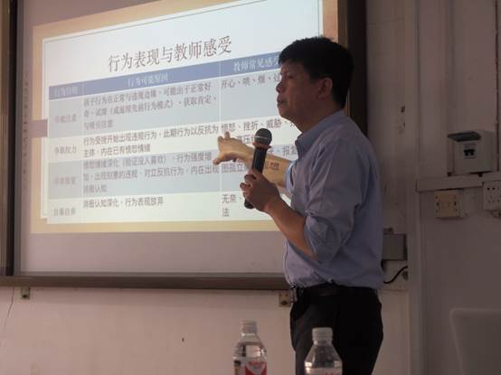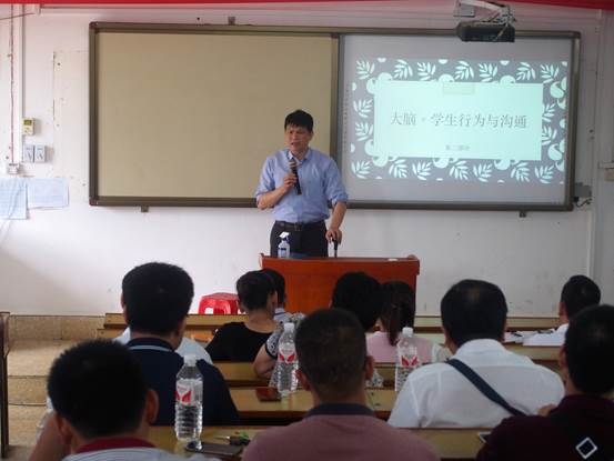 龙州县第一中学是13年正式由八所学校合并而成的龙州地区最大的初级中学,生源复杂,教师构成也比较复杂。在培训一开始,王志寰教授先从自己的出生,家庭环境进行了自我介绍,通过自我暴露,拉近和参与培训老师们的距离。接着,第一个主题“大脑。神经与压力”主要介绍了压力的来源,重点提醒老师,想要帮助学生,就要先爱护自己,引起了现场班主任的共鸣。而第二个主题“大脑。学生行为与沟通”,则系统地展示了学生行为的不同层级,并对班主任当如何应对不同层级的学生提出了相应的建议。比如,因为行为受挫开始出现违规行为的学生,那他可能是处于争取权利的层级,这个时候教师要克制自己的愤怒,必须不和孩子竞争、不向孩子投降、不忙着保护自我的权利,把思考放在当前欲解决的问题上,了解是什么因素使孩子必须这样行事。结束了上午的培训后,下午讲解的第三个主题“大脑。神经与学习”从生物学的角度介绍了,如何让自己的大脑更加健康有效的运作,从而可以更好地与学生沟通。最后,第四个主题是“校园常见问题与处理”。 王志寰教授首先教班主任从affection、behavior、cognition、desire等4个方面判断学生是否出现心理问题,再系统介绍了常见的问题,最后对班主任的处理方式给出了建议。