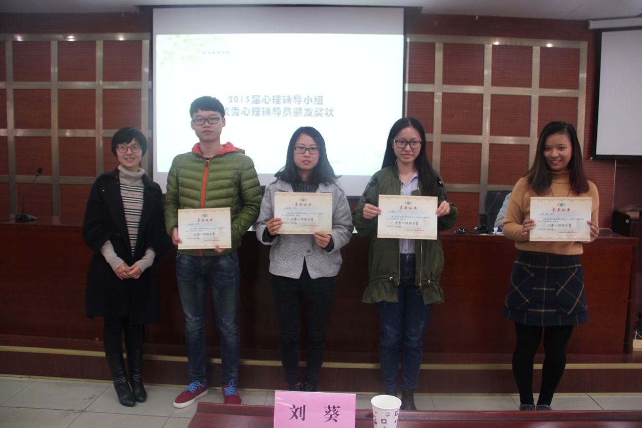 接着,刘葵老师为2015届优秀心理辅导员颁发奖状,并为2016届心理辅导小组颁发聘书。优秀心理辅导员代表刘春霞和心理辅导小组代表陈丹超也先后上台与大家交流心理辅导小组经验心得,表达了对这届心理辅导小组的期待。