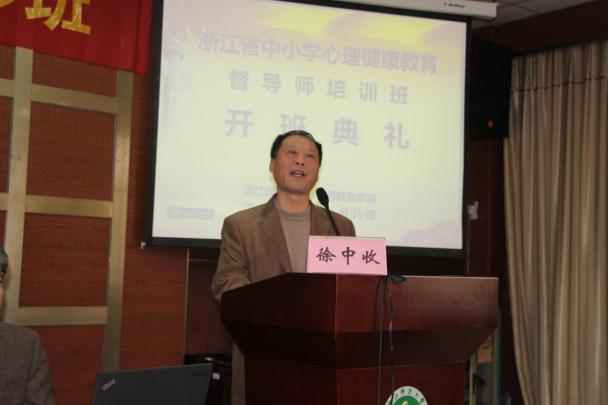 学员代表徐中收特级教师作了发言,他表示中小学心理健康老师在平凡的岗位上,不畏艰辛、积极探索,努力使自己成为心理健康教育方面的行家里手,但是工作中遇到很多的困惑,碰到很多的难题,急需要进一步地学习和充电。这次督导培训班的开班,正是给了大家久旱逢甘霖的大好机会,表示将以空杯的心态积极地投入到接下来的学习中,不断地提升自身的能力和水平,为今后更有效地开展工作打下扎实的基础。