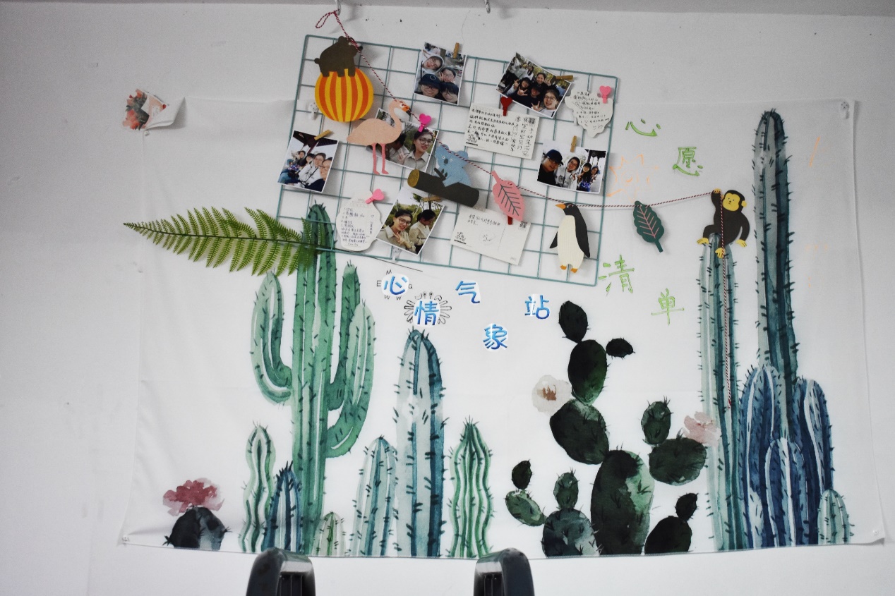 走进12-108寝室,“仙人掌”等绿色植株贴纸和挂件映入眼帘,以“绿色心情,青春活力”为主题的心情气象站使人心情舒畅,“每日心情”、“生活点滴”、“心愿清单”让气象站的作用得到充分发挥。