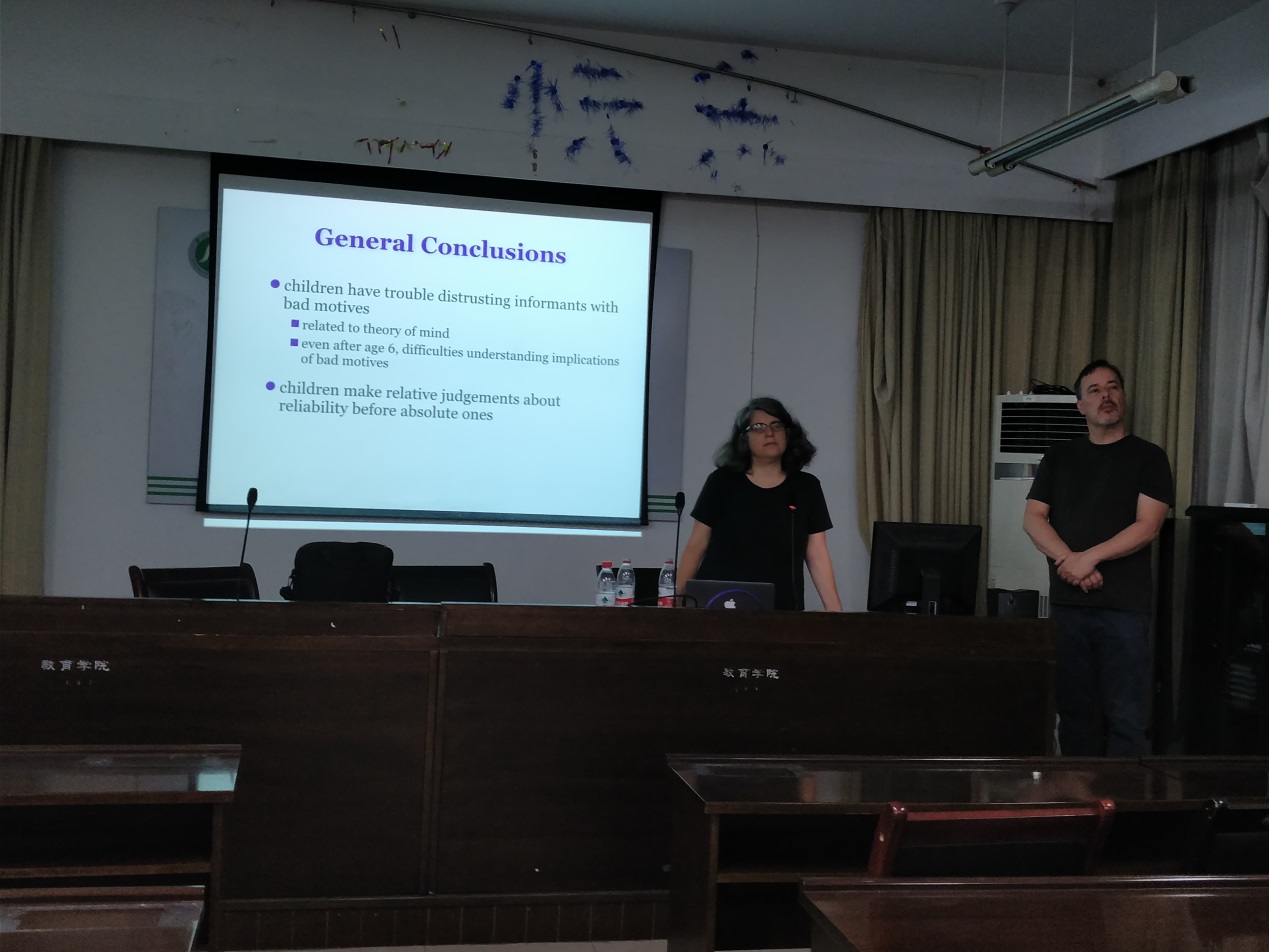 在过去的20年中,Heyman教授一直致力于研究儿童的社会性发展研究。在讲座中,她通过简单而有趣的实验设计,结合成人世界里对于外在线索的推断差异与疑问,为大家展示了儿童如何采纳与辨别不同信息提供者的情况。Heyman教授的行为实验展示了儿童对于有效的信息提供者与无效信息提供者在任务中采择发展过程。即,年幼的儿童能够选择采纳有效的信息提供者的意见来帮助自己完成相关任务,而不是那些糟糕的信息提供者。但是当只有一名信息提供者时,即使是一个糟糕的信息提供者,儿童也对提供者有着很强的采择倾向。儿童的信息推理以及相关的社会性发展能力与儿童的执行功能与心理理论发展密切相关。
