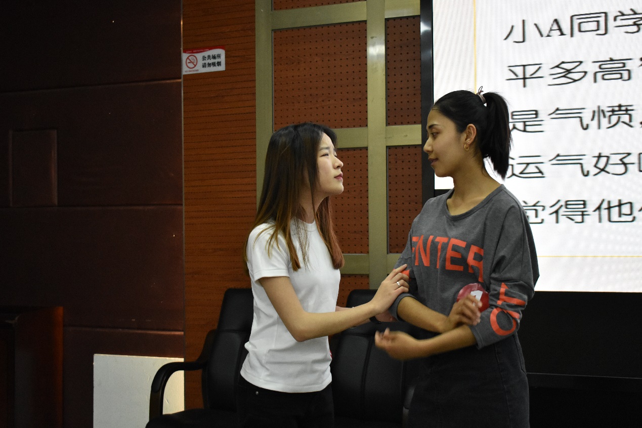 在“即兴案例情景展示与分析”环节中,各参赛队员沉着应战。第一组成员模拟寝室查四级成绩时产生冲突的情景,巧妙运用角色互换的方式化解矛盾,对寝室关系的建设提出了“尊重、倾听、学会接纳”的有效建议。第四小组生动演绎师生间由刻板效应引起的沟通误解,灵活地将所学的心理知识应用于实际生活中。