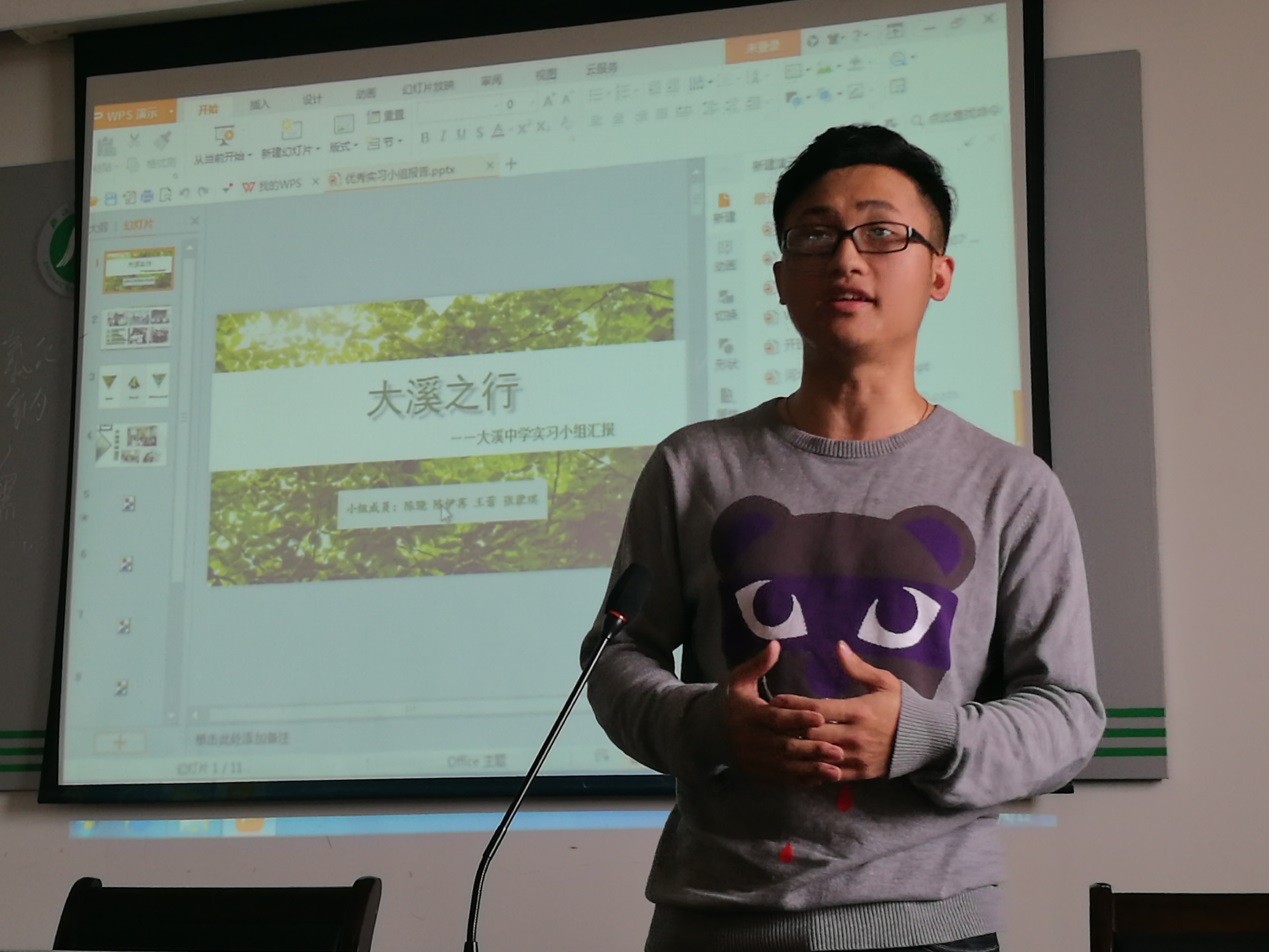 之后陈骁同学向在座的学弟学妹们分享了自己在温岭市大溪中学实习的经历。他表示,在那段时间里和伙伴们一起备课、磨课,给大溪中学的孩子们做团辅、办游园会、做个案咨询的过程让他收获的不仅仅是教师教学技能以及经验,更是一段非常充实欢快的回忆。