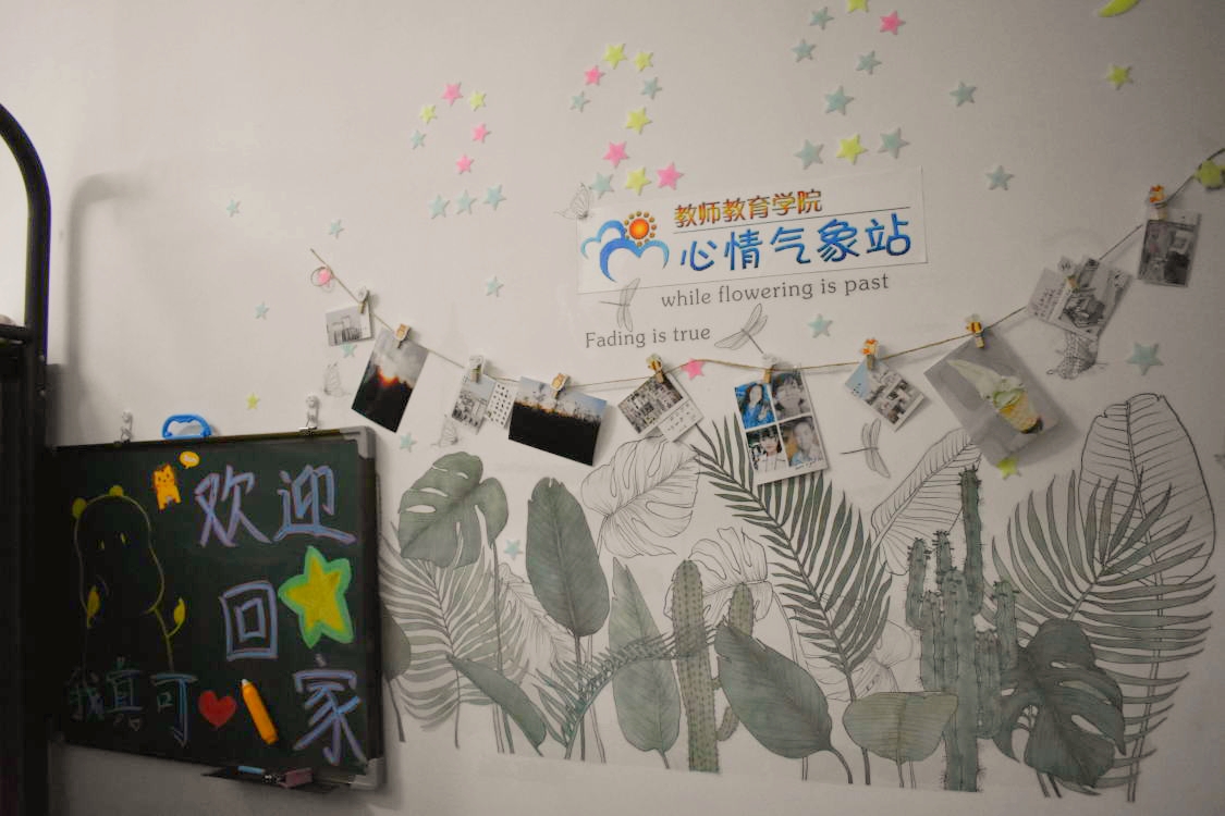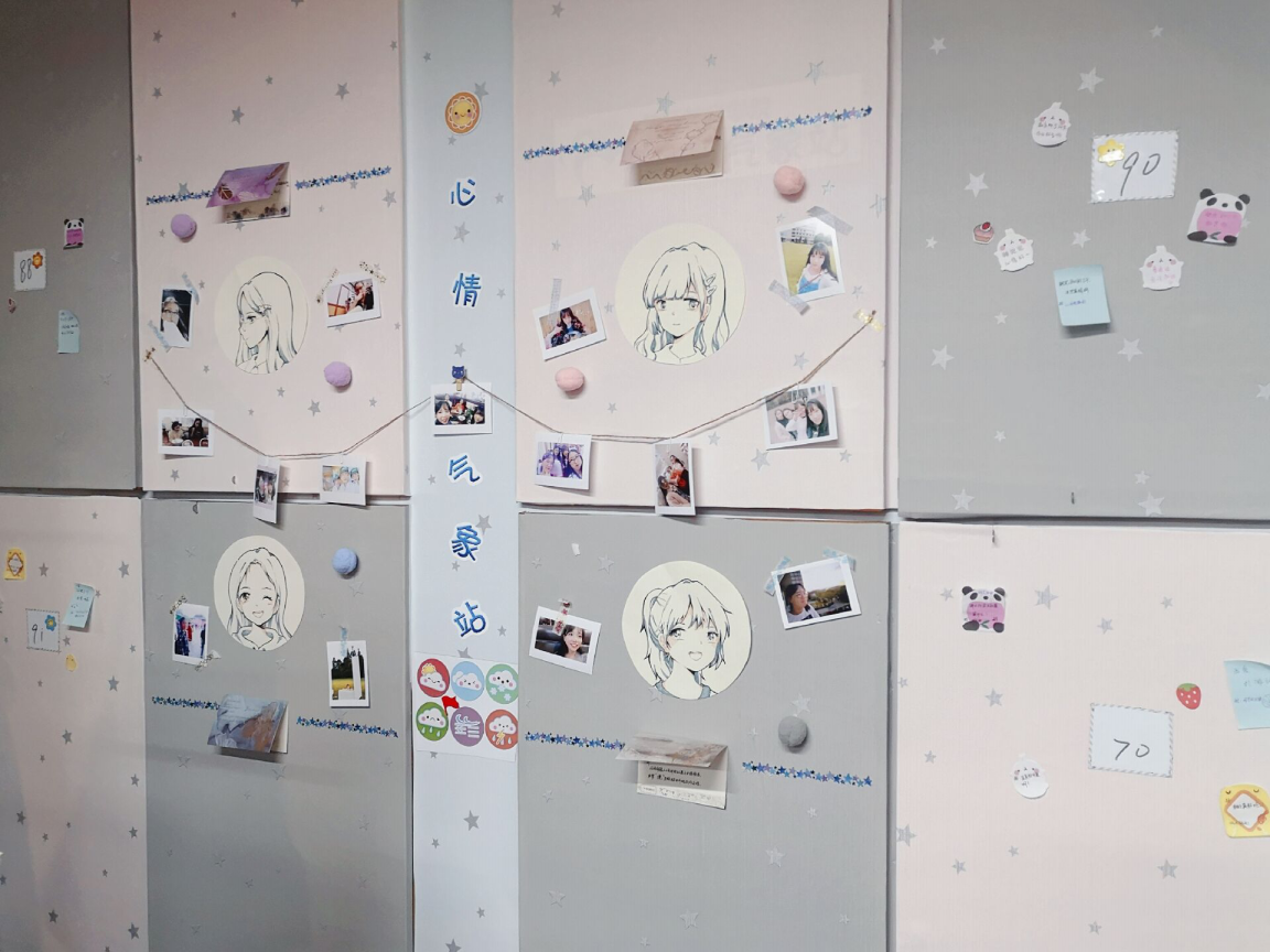 桃源12-311以“共享心情”为主题,将“心情气象站”打造成一个开放自由的平台。寝室成员每周都将心情指数写在气象站前,大家一起共享快乐、分担烦恼,并根据寝室心情指数贴上心情晴雨表。每人对应的卡通头像周围还有一片独立的区域,供大家书写自己的每日心情,以文字共享喜怒哀乐。