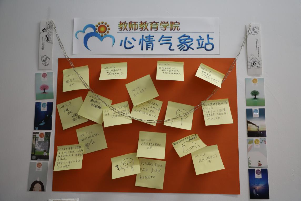 女寝的设计无不别出心裁、各具特色,而我院男生在心情气象站的建设上也同样不遗余力、大展风采。其中桃源15-104寝室“携手同行”的兄弟情让人印象深刻。气象站的两侧由长书签和明信片连成装饰串,橙色的主版则汇聚了寝室最重要的心灵动态,记录着寝室同学的心情变化。至于那串联两端的回形针链,无疑是他们兄弟间团结向上、携手前行的最好见证。