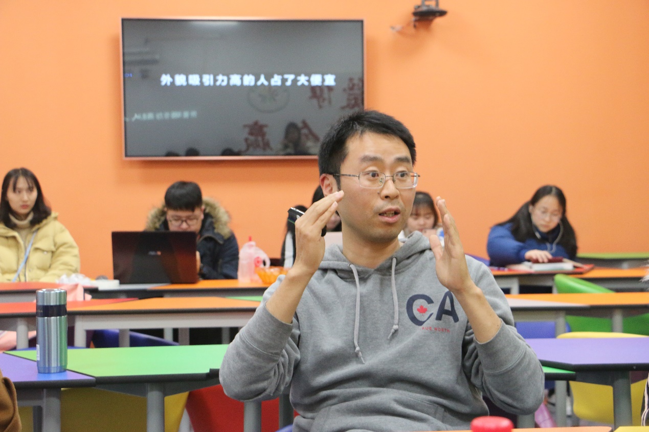 谈及入学前后的照片差异,李庆功老师讲述了自己曾因外貌变化太大被门卫拒之门外的心酸往事,并趣味地提出他的观点——外貌吸引力高的人占了大便宜。面对同学的质疑,他坦然自若,从现实层面、理论层面进行分析,旁征博引、条理清晰,得出“被公众认可的外貌特质其实就是健康的显露”的结论。基于此,他鼓励同学们平日里多笑、善待他人,必要时则辅以化妆,让外在为自己加分。