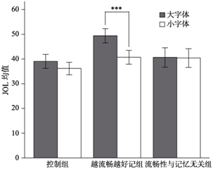 图2 实验1字体大小和组别的交互作用(图中误差线为标准误, ***表示p< 0.001)
