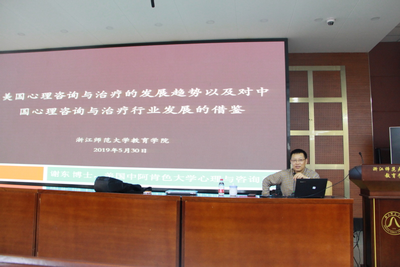 5月30日上午,美国中阿肯色大学心理与咨询系的谢东教授受邀在17幢112报告厅做题为“美国心理咨询发展趋势以及对中国心理咨询与治疗行业发展的借鉴”的学术讲座。讲座由曹晓华教授主持,来自心理学系师生共100余人参加了此次讲座。