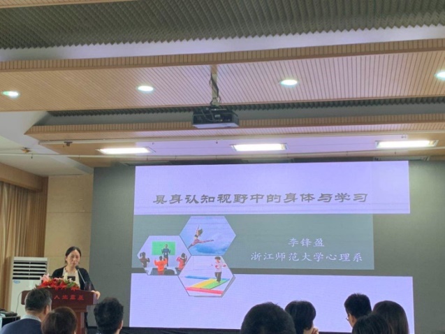 浙江师范大学教师教育学院心理学系李锋盈博士做了题为《具身认知视野中的身体与学习》的报告。锋盈博士通过手势促进数学学习等多个有趣的案例,展现出具身认知的特点及在教学中的应用。在浙江师范大学应用心理研究中心主任孙炳海教授团队的指导下,桐乡茅盾实验小学、海宁斜桥镇中心小学、衢州市实验学校、宁波市海曙区古林镇薛家小学、金华市金东区曹宅镇中心小学、嘉善杨庙小学分别做了题为《“从习到惯”的具身德育——茅盾实验小学养成教育十六年探索》、《皮影德育:让古老的皮影艺术成为新时代立德树人载体》、《美融各育·美美与共:审美德育实践与探索》、《水墨德育:利用书法教育提升学生道德素养》、《道情德育:小学生“尚善”教育途径创新》、《耕读德育:基于项目化学习培育麟溪学子》的教学改革成果报告。