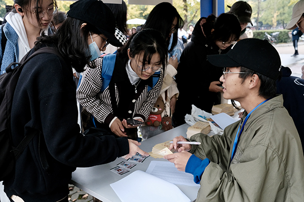 全场热闹非凡,人潮涌动,有一处展位却格外安静——展棚下的同学们高度专注地在一张方方正正的纸片上用黑笔描绘着,或是画出一条条变幻着的黑线,或是转动手腕绕出一个圆,简单的点线构成了一副不简单的画作。这就是浙师心理辅导站的传统项目——“禅绕画”,意求让学生们在创作的过程中接纳自己,释放压力。
