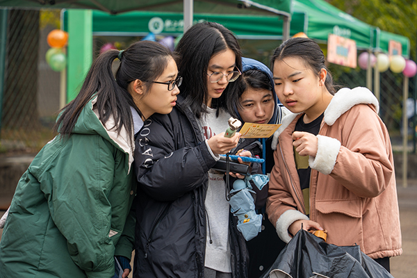 每个展区都有独属的特色。数学与计算机科学学院策划的“数海寻谜”中,参赛者们遨游在数字海洋,争分夺秒进行头脑风暴;马克思主义学院的“重走长征运粮路”则将红色长征和趣味游戏巧妙结合,不仅考察了参与者的党史知识,还通过蒙眼运粮的形式去身体力行地感受长征的艰难困苦;在文化创意与传播学院的“放心,我在”中,一人取水,三人协助扶持,充分展现了寝室之间相互合作扶持的团结精神。