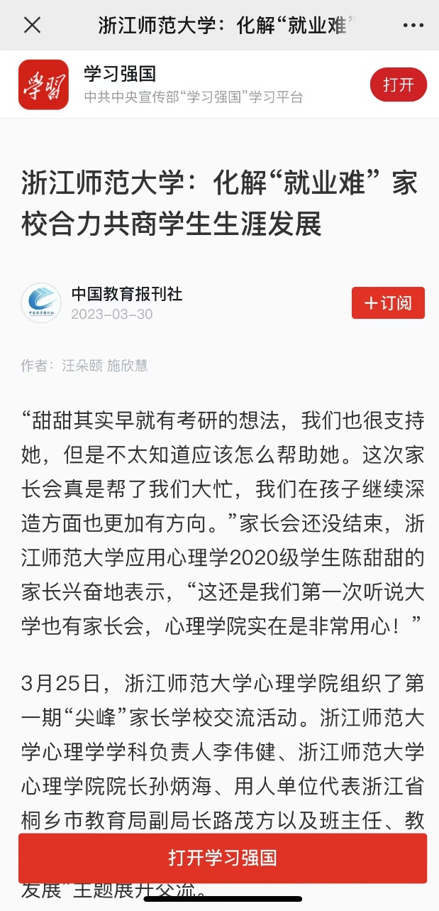 “永利23411将持续凝聚家校力量,力图提升育人工作实效,鼓励学生将生涯发展与社会需求相结合,将个人追求融入国家发展,成为有理想、有担当、有本领的浙师青年。”孙炳海说。