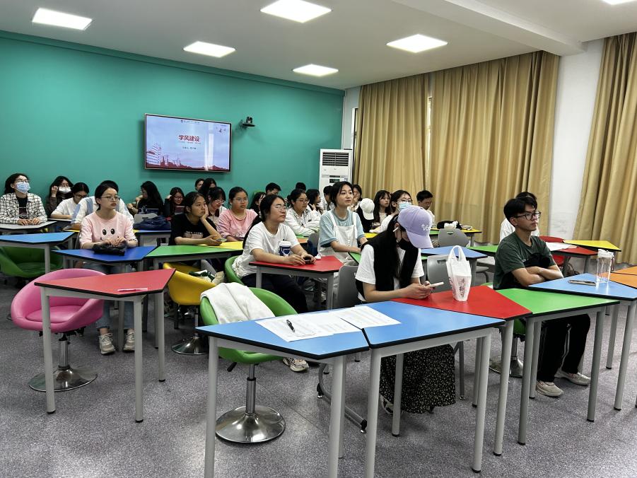 会议第一部分,夏子枫以“学风建设”为主题,强调作为学生干部,要有明确的个人定位以及拥有正确的团队认知,夏子枫提出“个人分工+团队合作才能最终实现共同目标”。最后,主讲人介绍了各部门的职能,以期增强各部门成员之间的相互了解,提高工作效率。