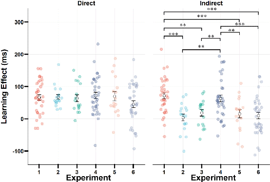 该研究结合社会学习迁移和统计学习中的序列反应时范式。实验一采用联合练习情景,将含有两个固定序列的刺激流分配给两名参与者,其中每名参与者仅需练习该刺激流中的一个固定序列,而不需要对同伴任务的固定序列按键反应。经过共同练习后,个体不但能够习得自己练习序列的规则(直接学习),还能习得同伴练习序列的规则(间接学习),表现为对自我与他人任务序列的反应时都显著下降。为了进一步探索和验证社会统计学习的认知机制,即共同表征,本研究系统地操纵练习过程的情景,分别采用了单人情景(单个被试独自完成学习阶段,实验二)、他人在场情景(与被动观察的同伴完成学习阶段,实验三)、信念情景(想象与同伴共同完成学习阶段,实验四)、意图不一致情景(同伴完成无规则的颜色识别任务,实验五)和基线情景(单个被试独自完成所有阶段,实验六)。结果发现,在信念情景(实验四)中被试同样表现出社会统计学习效应,即产生直接学习和间接学习效应。而在其他情景中(实验二、实验三、实验五和实验六),被试仅能习得自身任务规则,无法习得同伴或任务不相关的规则。