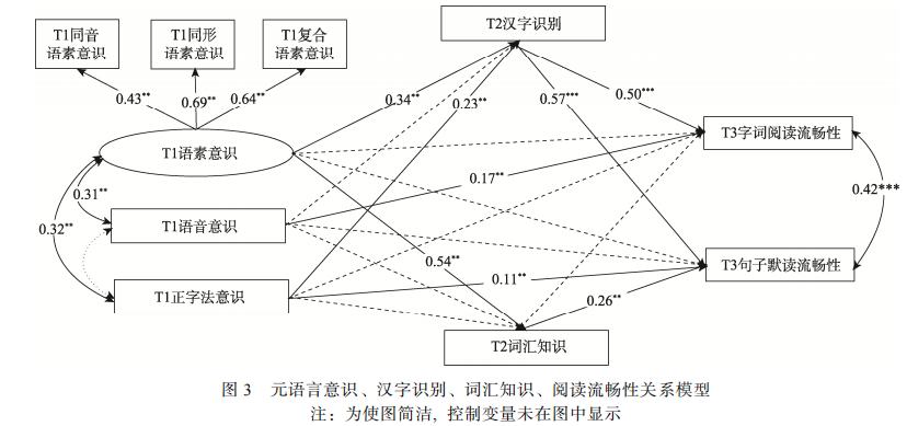DIER层次关系假设提出,阅读理解可能不仅会受到元语言层面的语音意识和语素意识的影响,也有可能会受到更高层次的阅读相关的认知技能,如阅读流畅性的影响。此外,字词阅读流畅性和句子默读流畅性作为阅读流畅性的两个不同方面也存在关系。当儿童的字词阅读流畅性达到比较高的水平时可以占用较少的认知资源,从而将更多的认知资源用于理解句子和提高句子阅读速度。因此,本研究系统地从亚词汇层面的元语言意识(语音意识和语素意识)到字词层面(字词阅读流畅性)再扩展到句子(句子默读流畅性)层面以致最后通达文本信息(阅读理解),从而全面地考察“学会阅读阶段”儿童阅读理解的内在机制。本研究发现语音意识和语素意识均能够直接预测阅读理解,也能够通过字词阅读流畅性间接影响阅读理解,还能够通过字词阅读流畅性影响句子默读流畅性并最终间接影响阅读理解。该研究验证了DIER层次关系理论在汉语儿童中的适用性,并对其进行了进一步的扩展,同时也为实践教学提供了参考。
