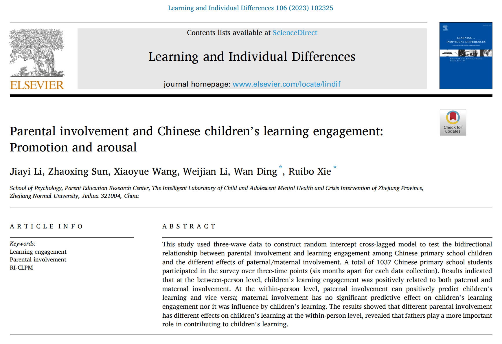 论文来源:Li, J., Sun, Z., Wang, X., Li, W., Ding, W., & Xie, R. (2023). Parental involvement and Chinese children’s learning engagement: Promotion and arousal. Learning and Individual Differences.