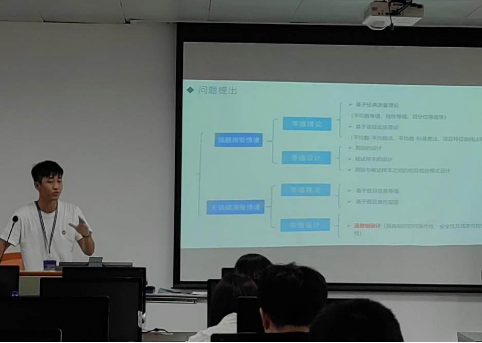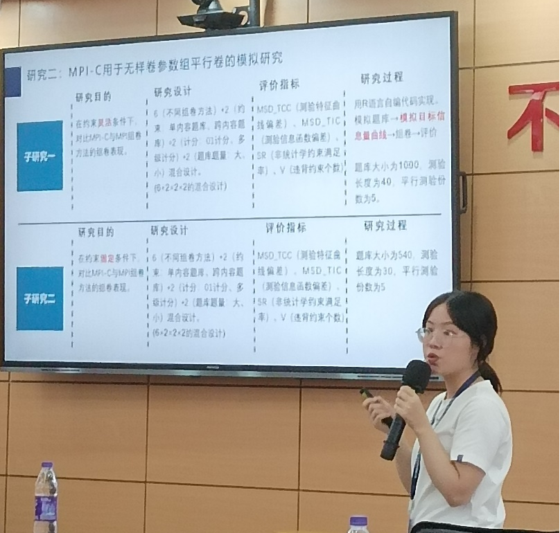 13日在分会场中,郑慧婧、赵振扬、苏胜、王汉秦、韩昳同学分别做了《能够满足多种内容约束和统计约束的新MPI组卷方法》、《联合作答反应和反应时的变点分析法》、《基于社会认知网络的大学生合作问题解决能力研究》、《事后引入多连接组的多群体无错题测验等值》、《基于卷入程度和协同性双视角的父母教育卷入类型分析》的报告,内容涉及智能测评下的统计与测量新方法新技术探讨,及家庭教育研究中的测评工具新开发,相关研究引起了与会者的热烈关注。