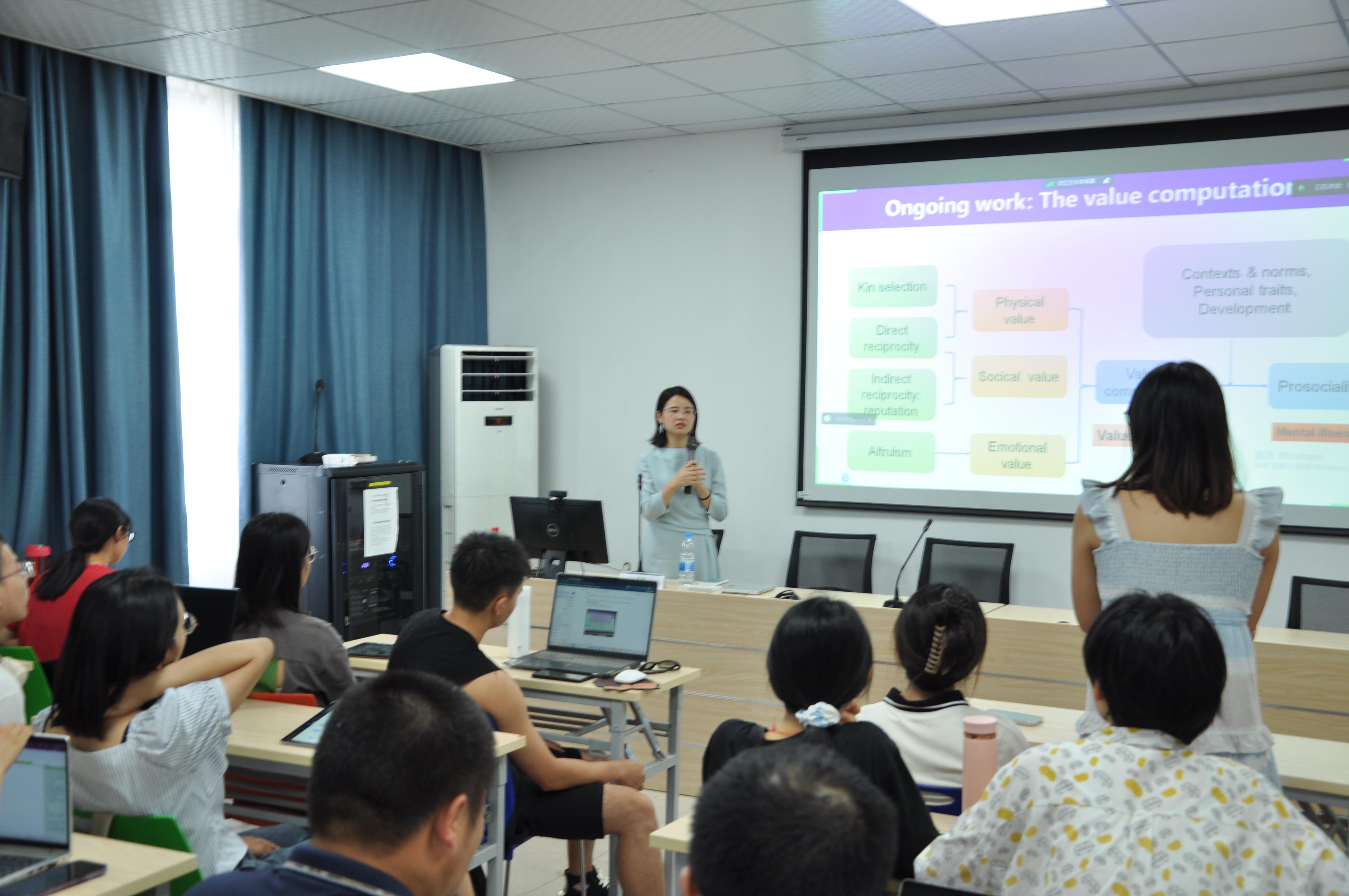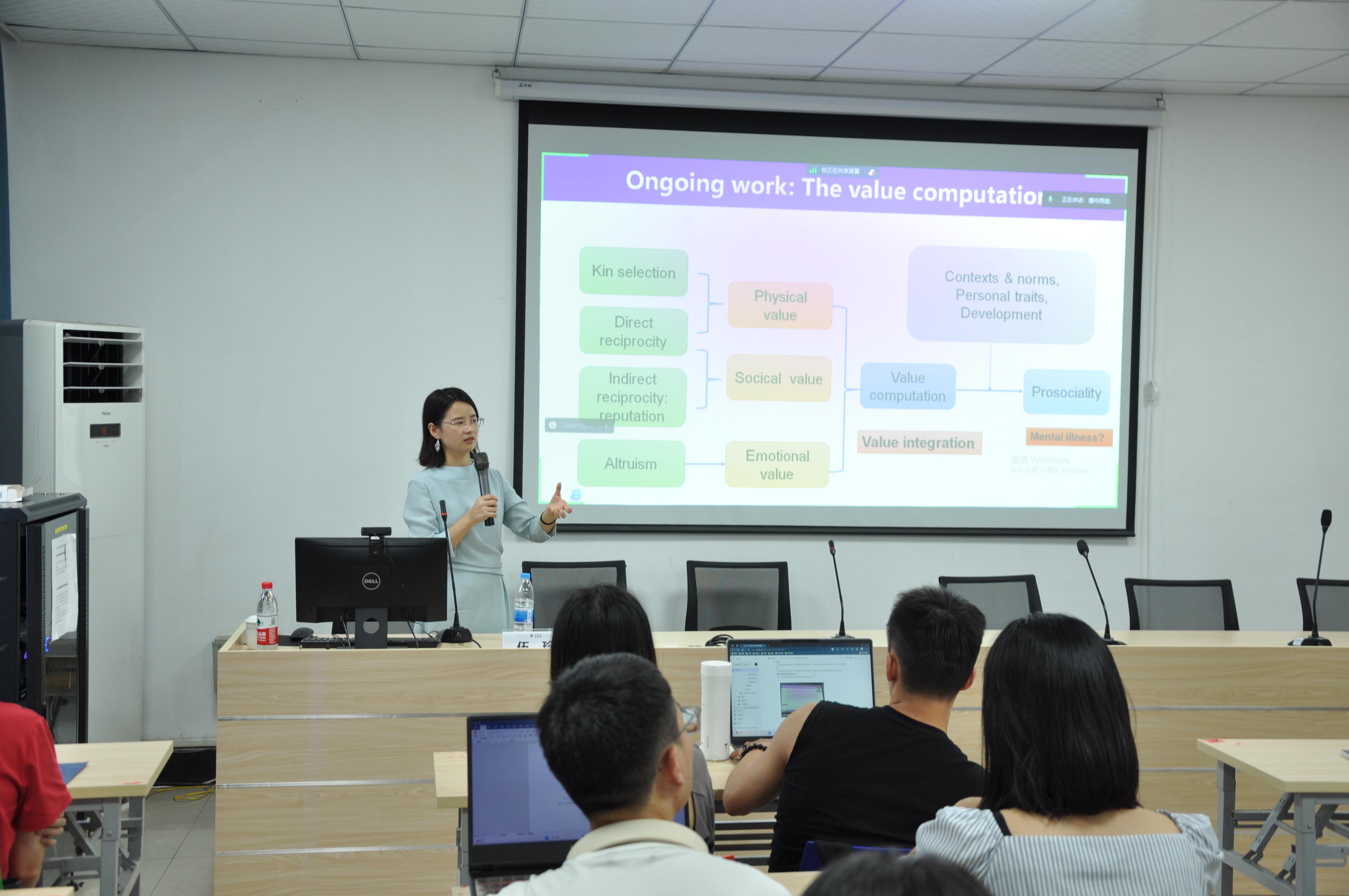 在第三部分,伍珍老师重点介绍了外在奖赏与内在奖赏的交互机制。伍珍老师指出,在现实生活中人们不会仅考虑自己的情绪,还会考虑外在的奖赏,因此伍珍老师的团队进一步研究了外在奖赏与内在奖赏的交互机制,并提出奖赏的量化机制。随后,伍珍老师向同学们介绍了其团队基于强化学习计算模型,所研究的不同年龄段、不同社会文化下的个体如何根据内在和外在的奖赏反馈动态调整其亲社会决策。最后,伍珍老师也提到了未来关于这一计算模型发展的构想,尝试将多个因素整合在一起,以解决价值判断问题,这是一项前沿且具有挑战性的任务。