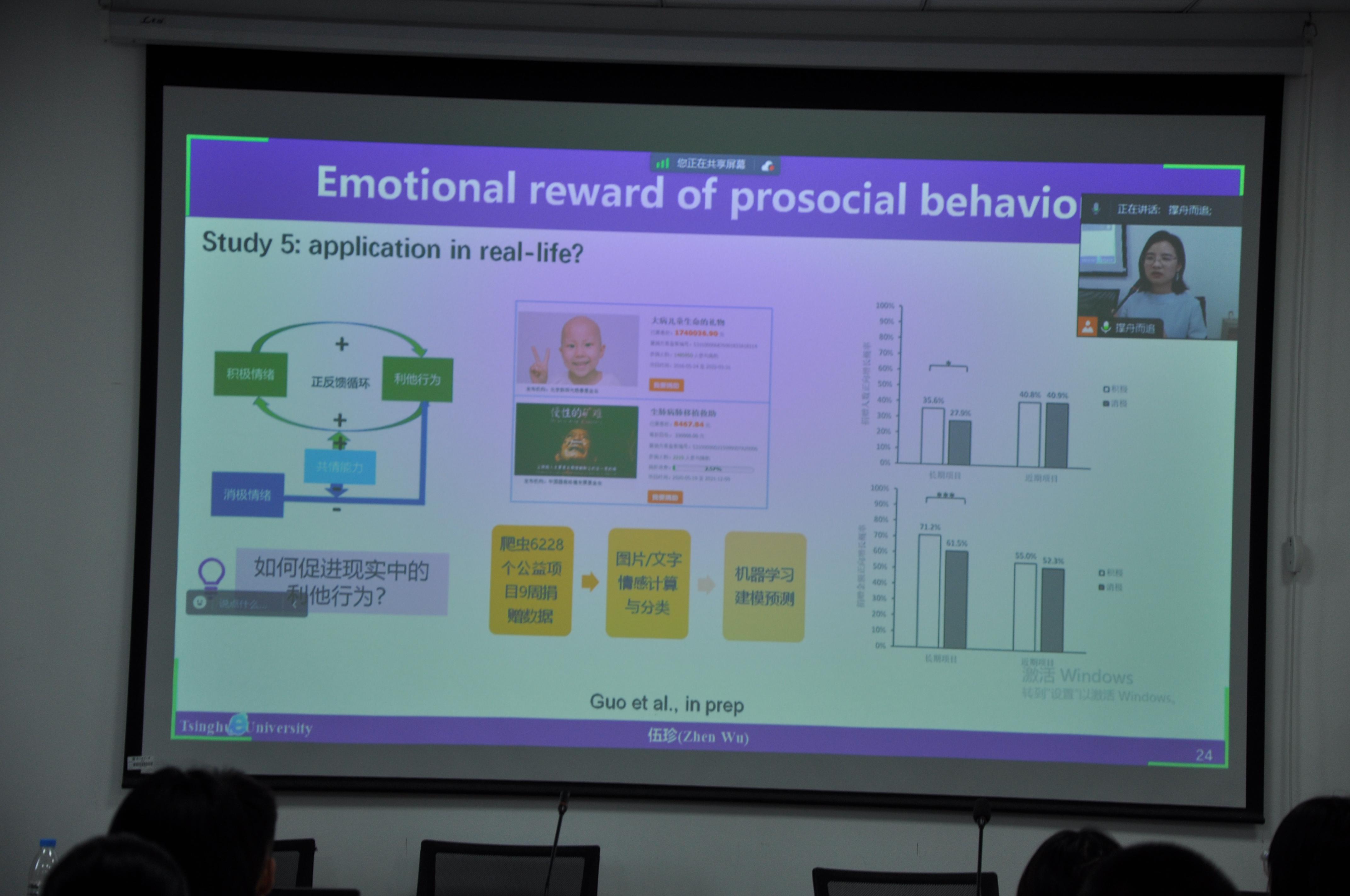 伍珍老师的讲座主要围绕亲社会行为的奖赏机制展开,分享了其课题组正在进行的一系列研究。在第一部分中,伍珍老师主要介绍了亲社会行为研究在心理学领域的重要性及其课题组当前的最新研究动态。伍珍老师指出,亲社会行为的关键在于期待回报,内在奖惩和外在奖惩都会促使亲社会行为的产生,并提出在现实生活中人们面对这些奖惩都会存在一个价值计算的过程。因此,她带领课题组成员着重研究了影响价值判断过程的多种因素,包括社会文化规范、个人特质、个体发展阶段等。