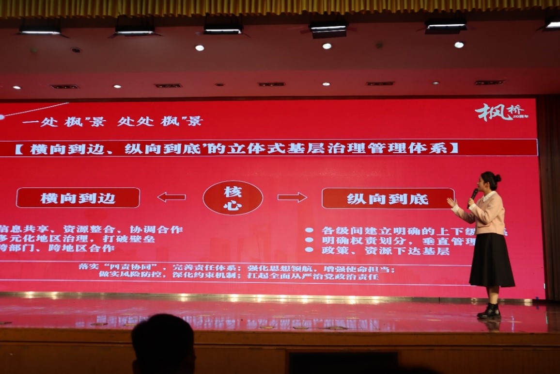浙江枫桥是时任浙江省委书记习近平同志“八八战略”的实践模范地区,在基层治理中发动和依靠群众来解决矛盾的“枫桥经验”也在新时代背景下走出枫桥,推广到全国更多地区落地生根。在比赛中,王维苑同学结合自己幼年及暑期参加院实践队在浙江枫桥的所见所闻,带领大家深刻领略了在“八八战略”下枫桥镇通过与时俱进的“枫桥经验”所获得的“变”与“新”。作为枫桥变迁的亲历者,以王维苑同学为代表的心理学子跟随习近平总书记深入群众的步伐,结合心理学科优势,通过心理知识科普、开班宣讲、团辅教学等多种形式,在寓教于乐中推进心理健康建设。最终,王维苑同学以优异的表现荣获三等奖。