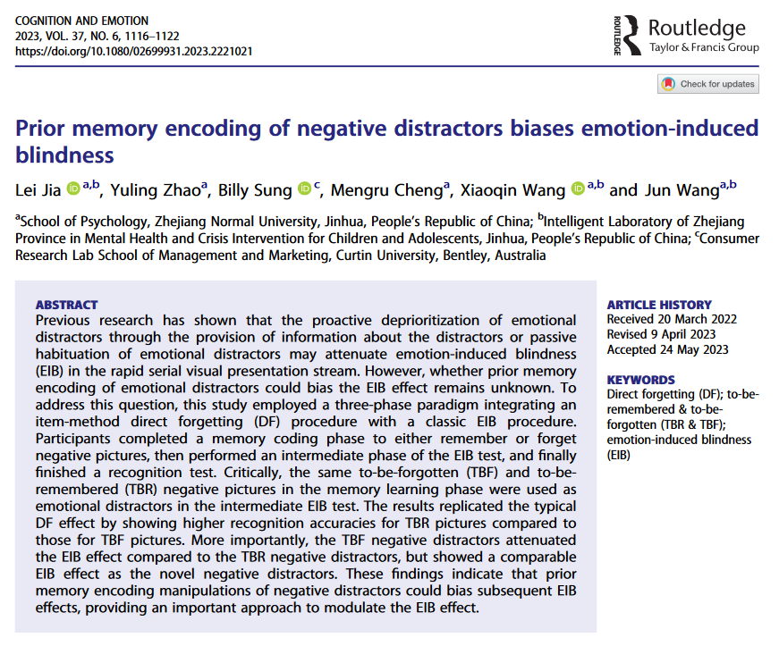 近期,永利23411集团贾磊副教授团队在国际期刊Cognition and Emotion(JCR Q2)在线发表了题为Prior memory encoding of negative distractors biases emotion-induced blindness的学术论文。该研究结合情绪诱发视盲任务和定向遗忘范式,检验了记忆编码对负性干扰物情绪诱发视盲(emotion-induced blindness, EIB)的影响。贾磊副教授为本文的第一作者和通讯作者。该研究得到了浙江省自然科学基金项目(LY20C090003]的资助。