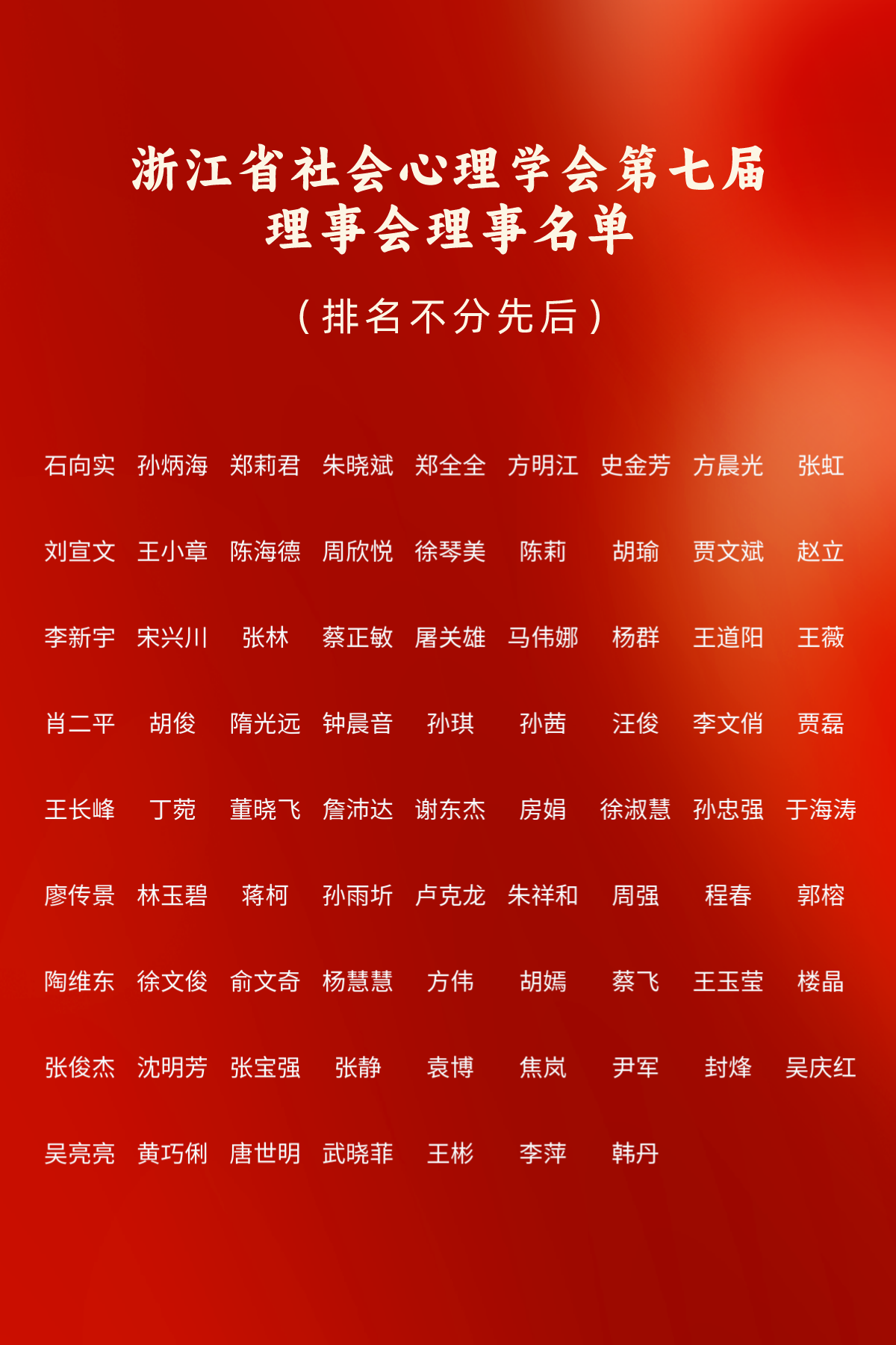 第七届理事会第一次会议选举孙炳海为会长,推选石向实为荣誉会长;朱晓斌、刘宣文、张虹、方明江、史金芳、胡瑜、徐琴美、陈莉为副会长。第七届理事会在中午继续研究2024年及任期内的工作计划,重点强调要聚焦浙江省经济社会发展的重点,发挥学会的应用作用;发挥学会的专业性作用,加强社会心理的基础研究和科学普及;团结全省心理学界的力量,发挥合作共建共享的作用。