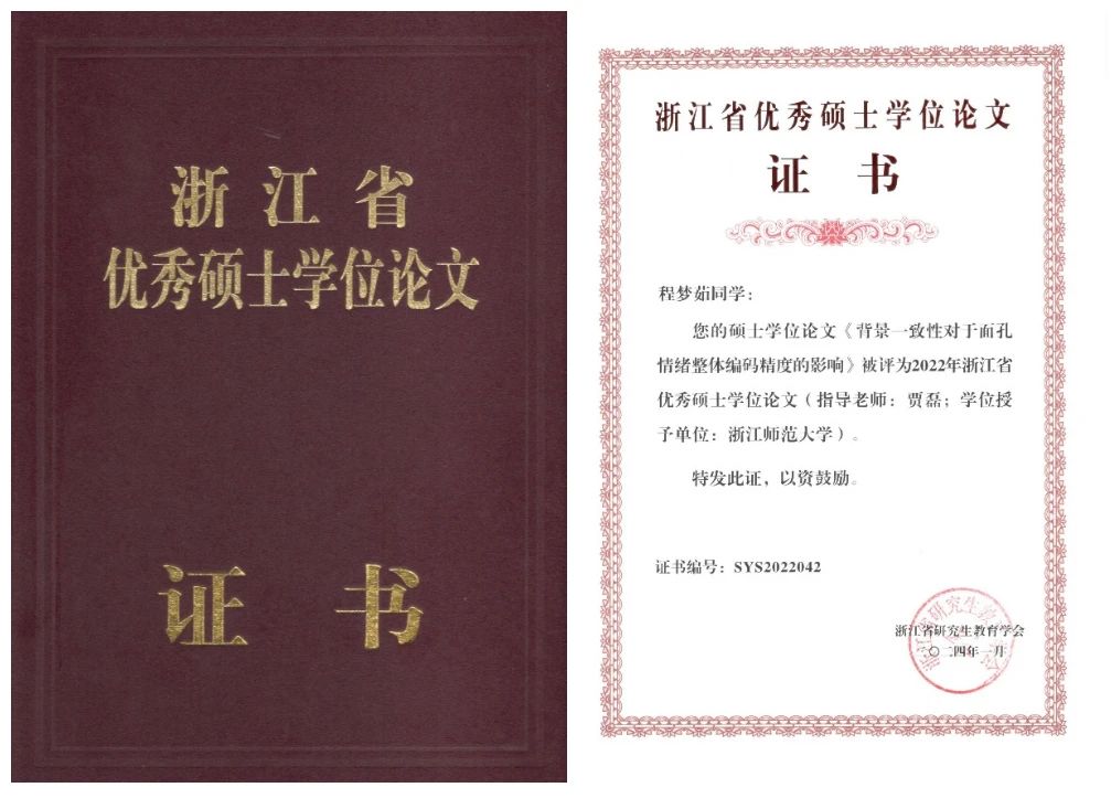 近日,浙江省研究生教育学会发布了2022年浙江省优秀硕士学位论文名单,我院2022届心理学专业毕业生程梦茹同学毕业论文获评省优秀硕士学位论文!程梦茹同学硕士期间学习认真刻苦,在导师贾磊副教授指导下在Psychonomic Bulletin & ReviewFrontiers in Human NeuroscienceCognition and Emotion等国际知名学术刊物上发表多篇学术论文。