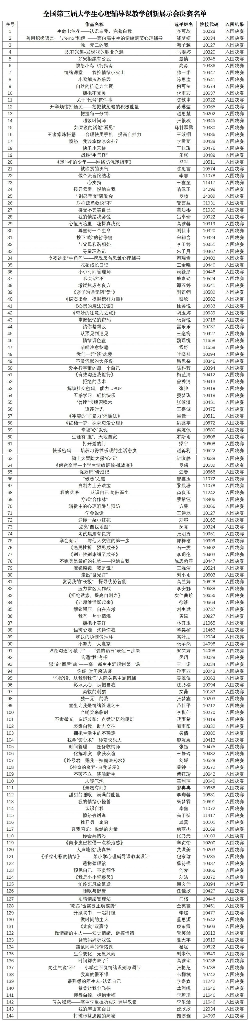 经专家对288个作品评审,共有144名选手入围全国第三届大学生心理辅导课教学创新展示会决赛。现公布决赛名单,决赛事宜通知如下。