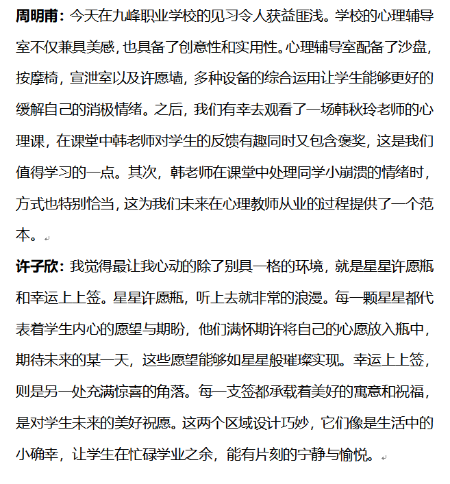 通过本次见习活动,同学们具体感知了学校心理辅导室的文化建设和青春期学生的心理需求,同时深入辅导活动课课堂,观摩优秀教师的教学过程,进一步学习了教学知识和技能,也深刻体会到作为中小学心理健康教育教师的职责和使命。