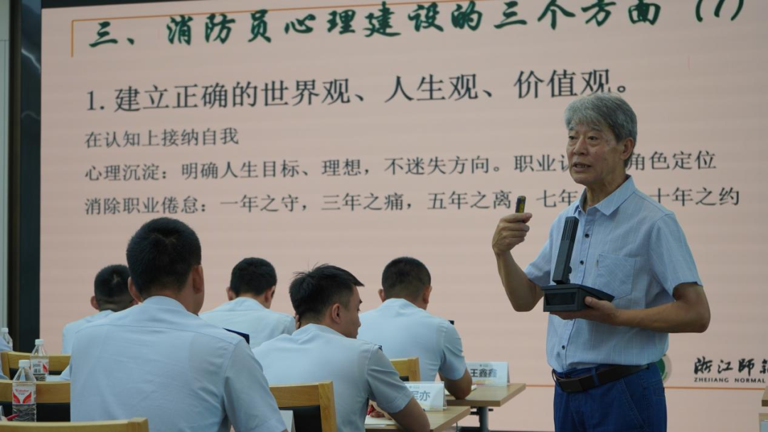 7月19日,浙江省消防救援队伍心理骨干培训班结业仪式在17幢112报告厅举行。孙炳海院长作了结业讲话,高度赞扬了消防救援队伍并受党委副书记吕迎春委托向全省各级消防救援部门和广大指战员表达了感谢,对消防救援队伍的心理健康建设提出了四项建议:一、提高协助求助者自我成长的心理赋能水平,达到高效救援;二、要及时评估和干预救援后消防人员的心理情况,防止其二次创伤;三、要做好心理问题的预防工作,防患于未然;四、要提高消防救援人员自身的心理健康赋能能力,增强队伍凝聚力。最后,省总队戴慧峰副主任对此次培训的课程安排和培训效果表示高度肯定,并希望在未来进行更深入的交流与合作。