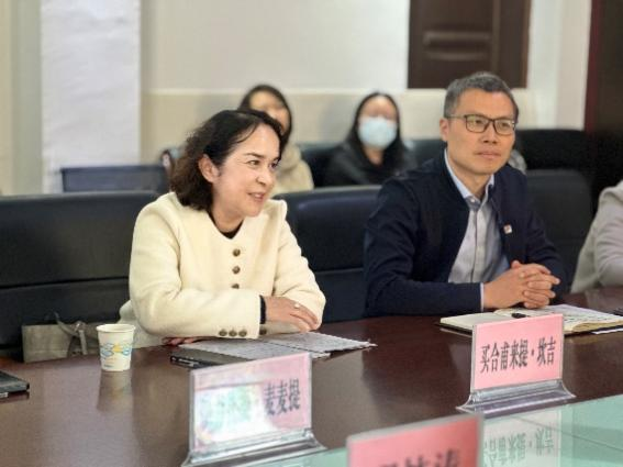 为了贯彻师范教育协同提质计划,孙炳海与办公室副主任邢林涛、辅导员萨依甫加马丽和伊犁师范大学教育科学学院院长马永全、书记郑杰、副院长赵雪艳、副院长裴昌根等就学生的专业方法训练、教师走访交流等方面达成合作意向,为后续两校资源共享和学科建设打下基础。