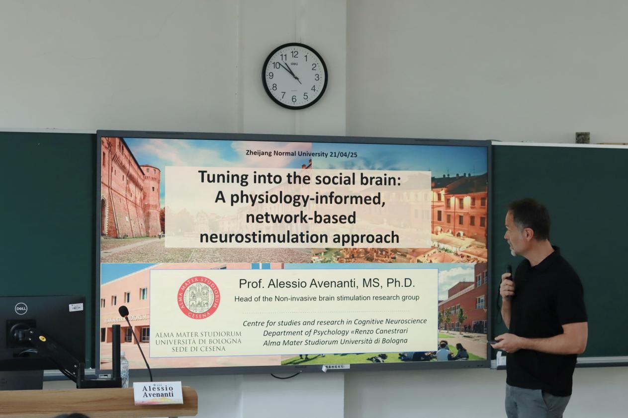4月21日上午,永利23411尖峰卓越心理讲堂第一百十二讲邀请到了意大利心理生理学与认知神经科学学会副会长、意大利博洛尼亚大学永利23411教授、博士生导师Alessio Avenanti,为我院师生带来了题为《Tuning into the social brain:A physiology - informed,network - based neurostimulation approach》的精彩讲座。讲座由浙江师范大学特聘教授贾熙泽主持。