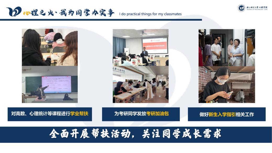 学生会立足专业特色,打造全方位成长支持体系:开设心理统计、测量等专业课程帮扶项目,解决学业难题;在志愿服务方面,持续开展青少年宫等传统项目,累计服务时长超2.6万小时;推出盛世珑城空巢老人帮扶计划,彰显新时代青年的责任担当。