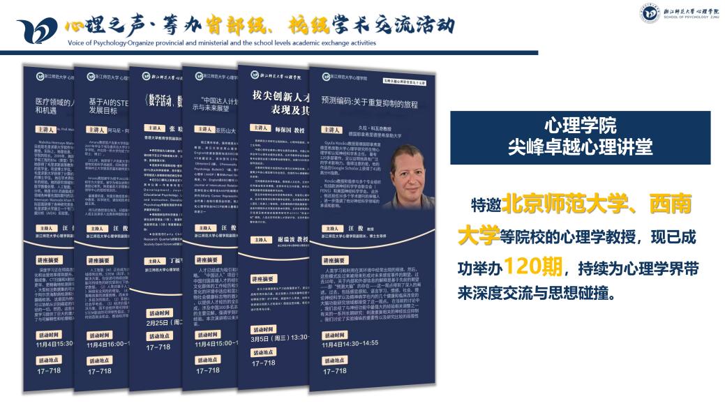 研会充分发挥专业特色,为研究生们搭建了多层次、立体化的学术交流平台。其中,“心无界·理致远”学术文化节汇聚专家报告与学术汇报,线上线下辐射;134期“尖峰卓越心理讲堂”为研究生科研能力提升提供了有力帮助。