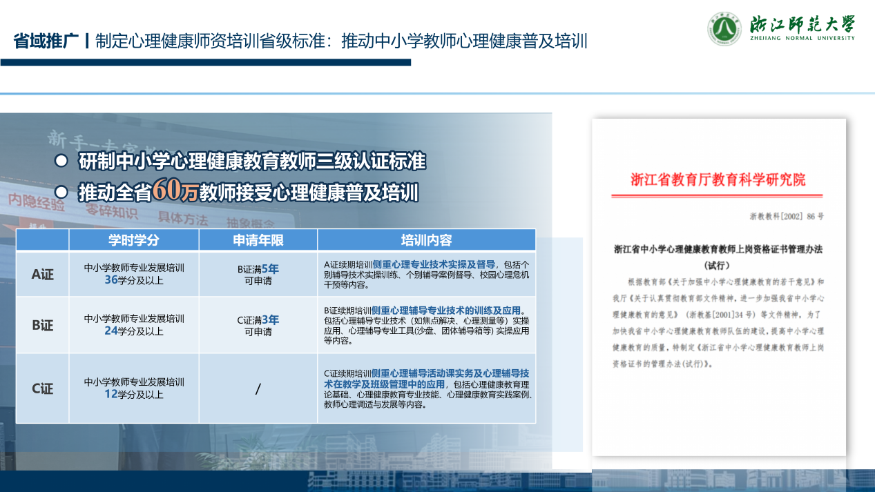 在机制构建方面,项目创新推出中小学心理健康工作动线“卡位手册”,实现职责可视化、流程标准化;牵头制定浙江省中小学心理健康教育教师上岗认证标准,推动全省近60万教师接受心理健康普及培训;开发了3门国家级课程、2个全国首批微专业、12门网络课程及7门公益心理调适微课,构建了多层次、全覆盖的数字化课程体系,视频点击量破百万。