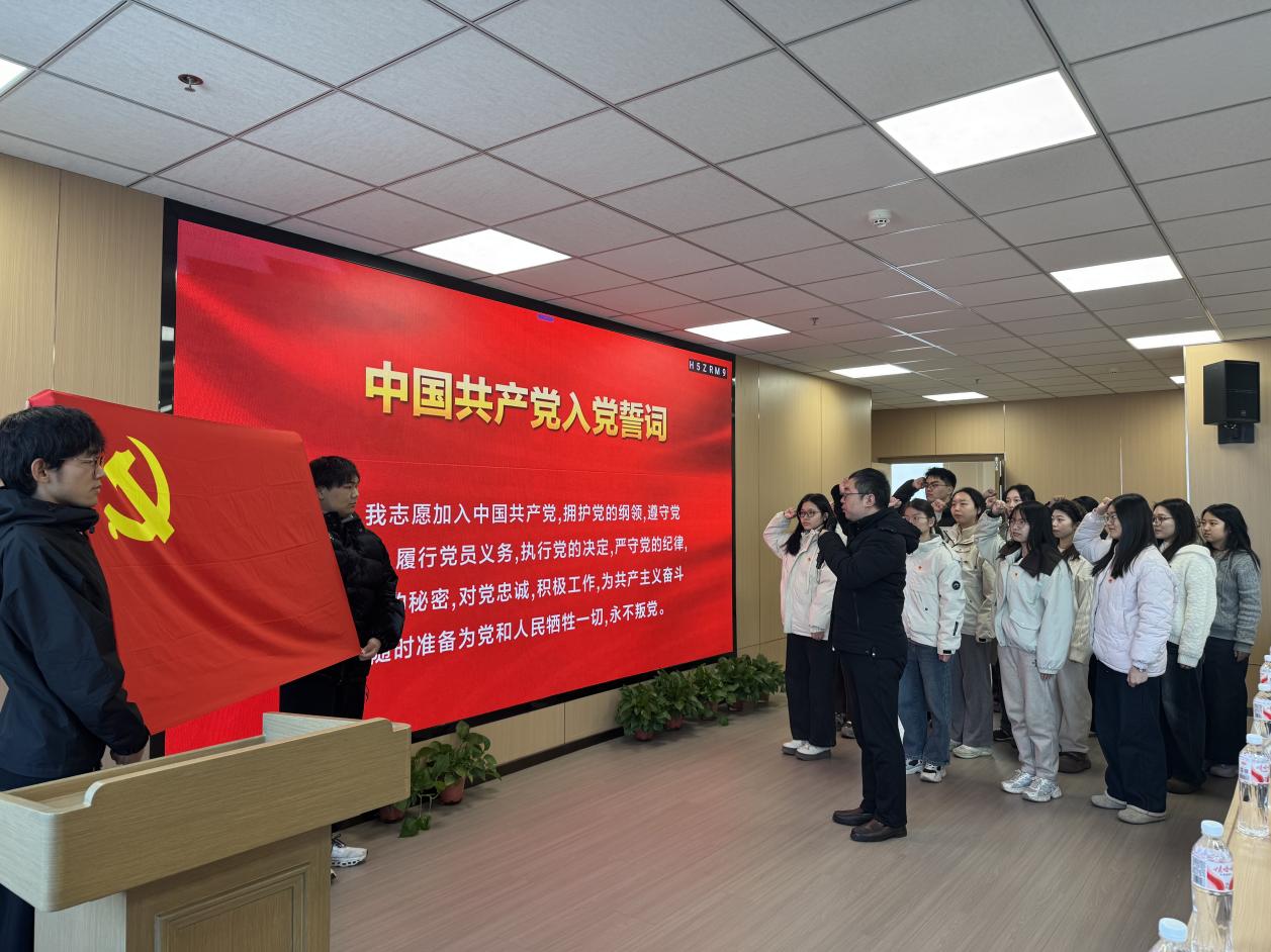 会议伊始,全体新发展党员庄重地将党徽佩戴于左胸前。在学院纪委书记、副院长贾磊的带领下,全体新发展党员面对鲜红党旗,高举右拳,庄严宣誓。这枚徽章,承载着党组织的信任与期许,更凝聚着共产党员的使命与荣光。